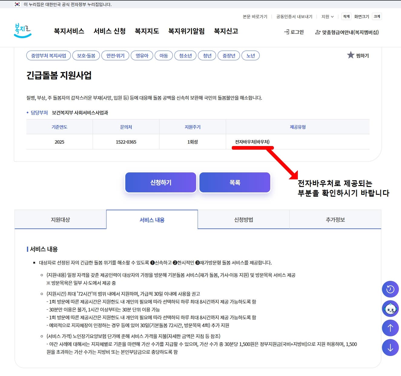 항목내용지원방식 전자바우처 (예: 시간당 요양보호사, 간병인 지원) 지원주기 1회성, 단 위기상황 재발 시 재신청 가능 서비스 범위 기본 일상 돌봄, 간호, 외출 동행 등 연령제한 주로 성인 대상이지만, 예외적으로 아동도 가능
