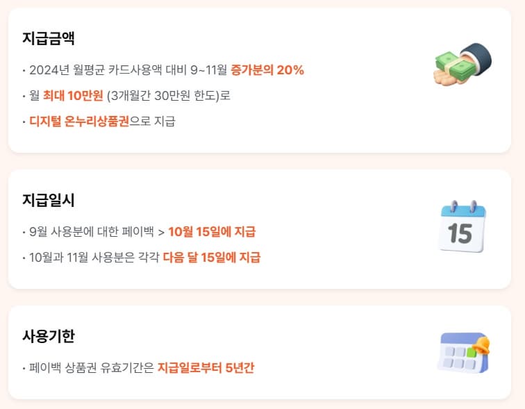2025년 9월부터 11월까지 카드 사용 실적이 작년 동기간보다 늘어나면, 증가한 금액의 20%를 최대 월 10만 원, 총 30만 원 한도로 돌려받을 수 있습니다.📢 예: 작년 9월에 50만 원, 올해 9월에 100만 원 사용했다면?